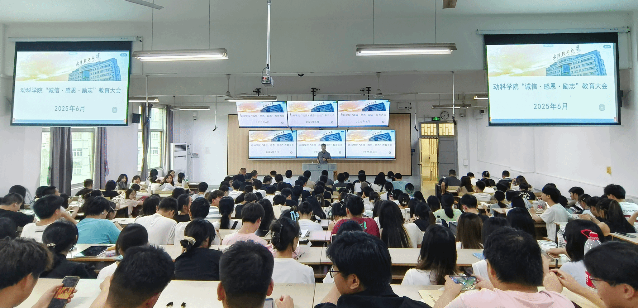 6月17日晚,动科学院在乐学楼508召开“诚信•感恩•励志”主题活动暨2026届本科生考研就业动员大会。院党委书记李斌斌、副院长易丹、院党委副书记田兴恒、各系主任、班主任和2022级本科生参会。会议由2022级本科生辅导员王佳伟主持。