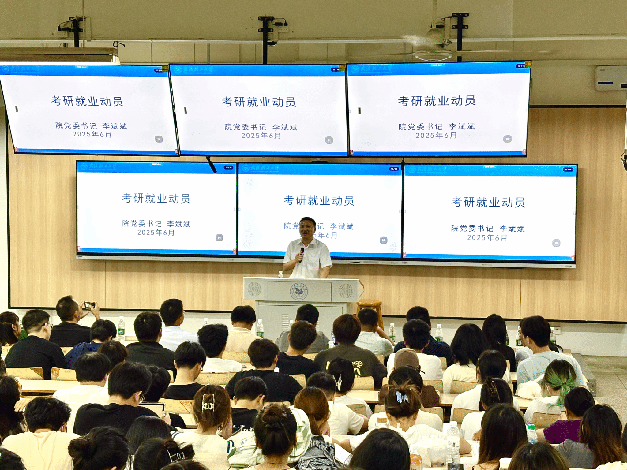 李斌斌介绍了近年学院考研就业形势,向2026届本科毕业生提出三点希望。一是合理制定考研就业目标,通过一条经验和一个教训勉励同学们在考研就业中争取主动,避免盲目跟风选择热门赛道。二是科学规划职业路径,在考研、就业、考公中做好充足准备,把握“自我认知”与“外部调研”两个关键。三是保持坚韧心态,以积极姿态拥抱成长与可能,平衡学业与生活,通过运动、社交、兴趣爱好释放压力,保持身心健康。他强调,多年来学院始终践行“每个学生都很珍贵”的学生工作理念,在考研就业中会为每名学子提供优质、暖心、周到的服务保障,千方百计促进毕业生高质量充分就业。