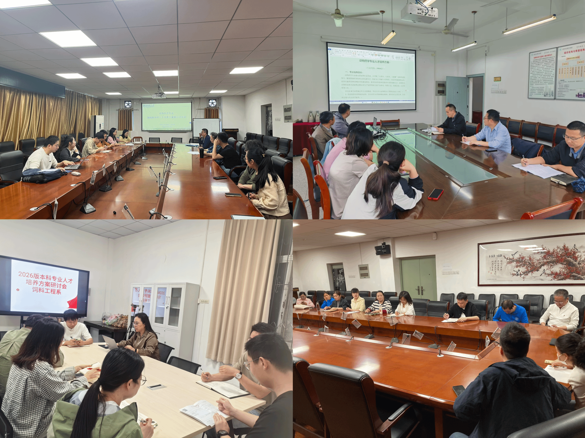 随后,动物科学、饲料工程、动物药学、水产养殖四个专业分别组织专任教师开展专项研讨,围绕新版人才培养方案修订的总体思路、核心细则、修订重点及具体要求展开,全程聚焦专业发展前沿、行业岗位需求与应用研究型人才培养目标,逐项梳理现有培养方案的优化空间,扎实推进方案修订工作落地落细。参会教师分别就课程体系优化、实践教学环节、AI + 课程融合、课程思政建设等重点内容充分研讨、细化论证,确保方案贴合行业需求、符合育人规律。